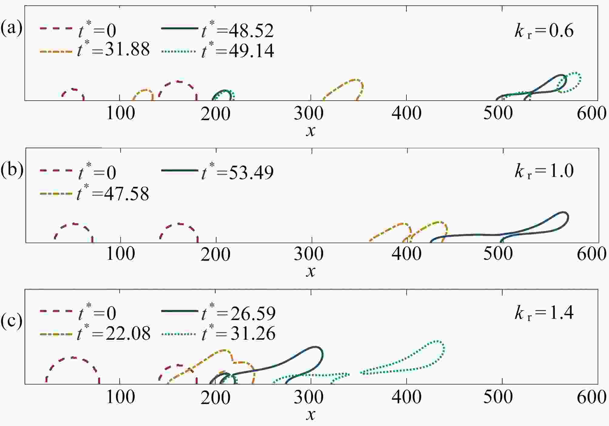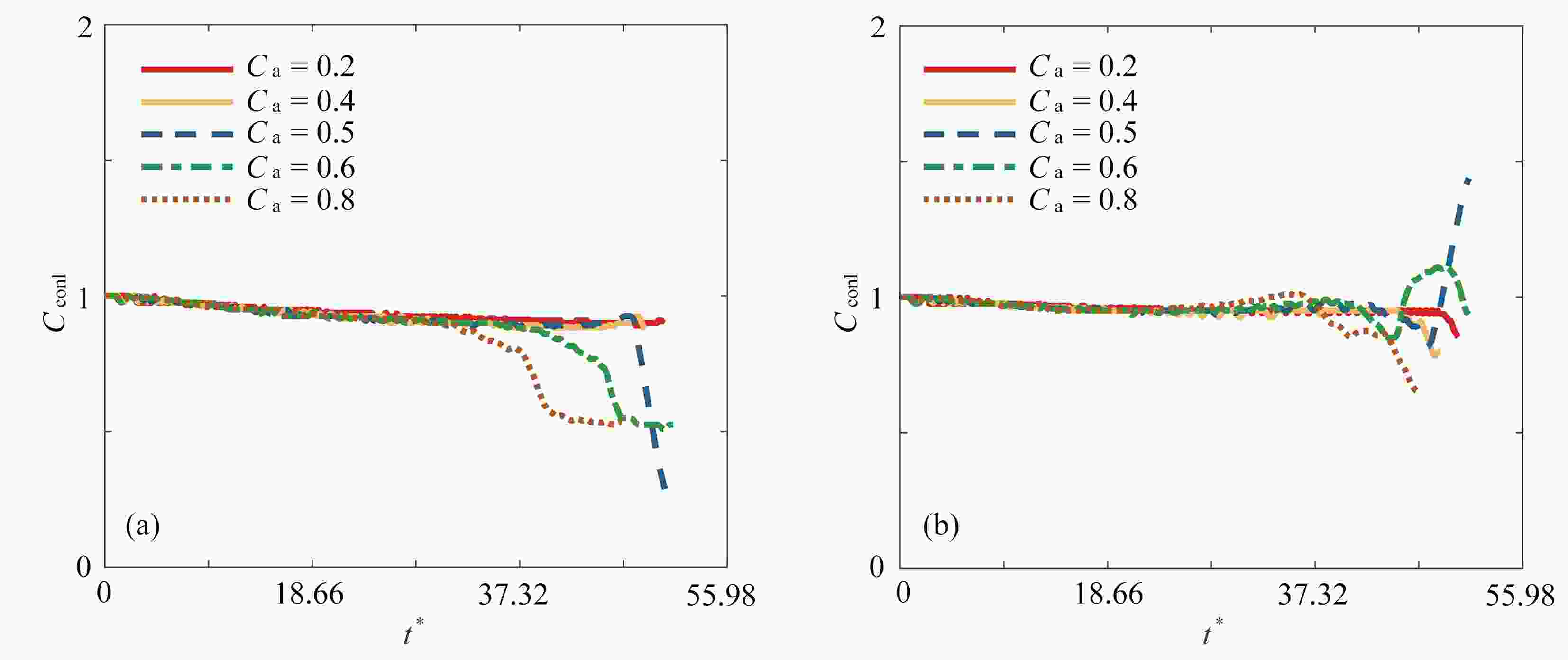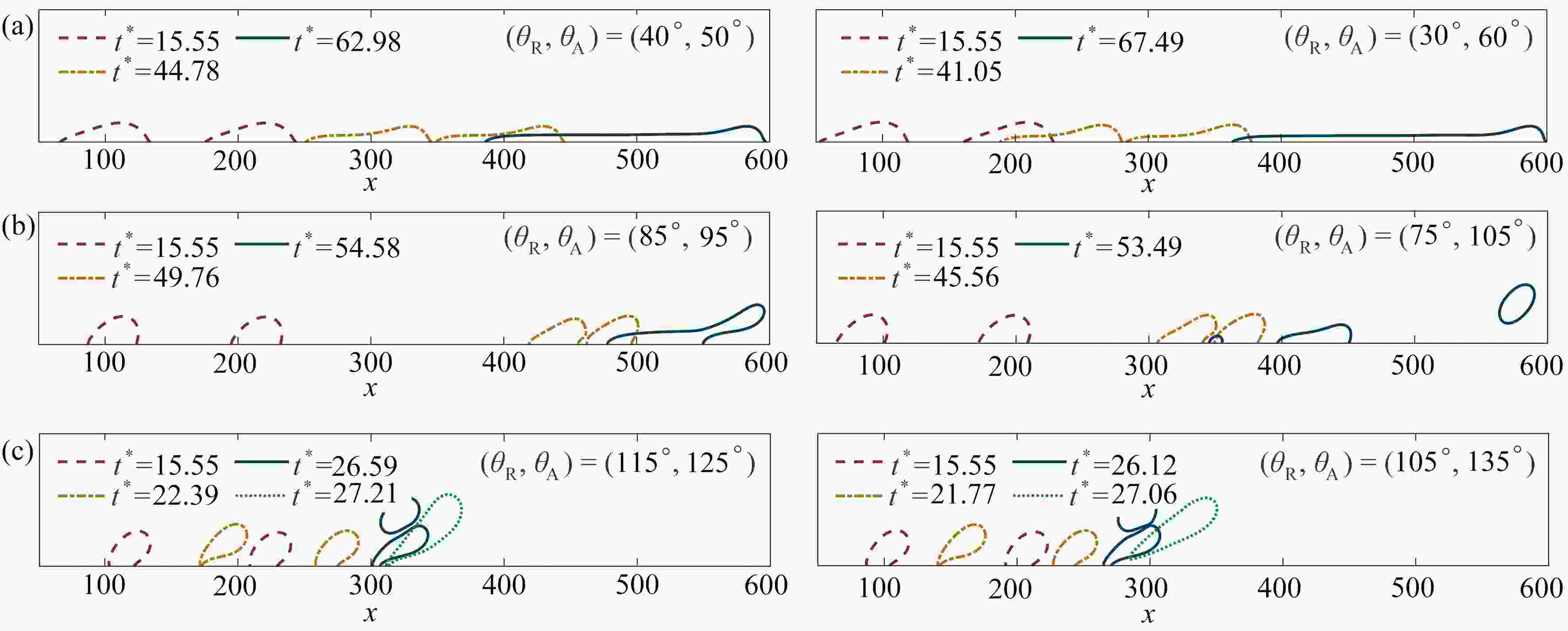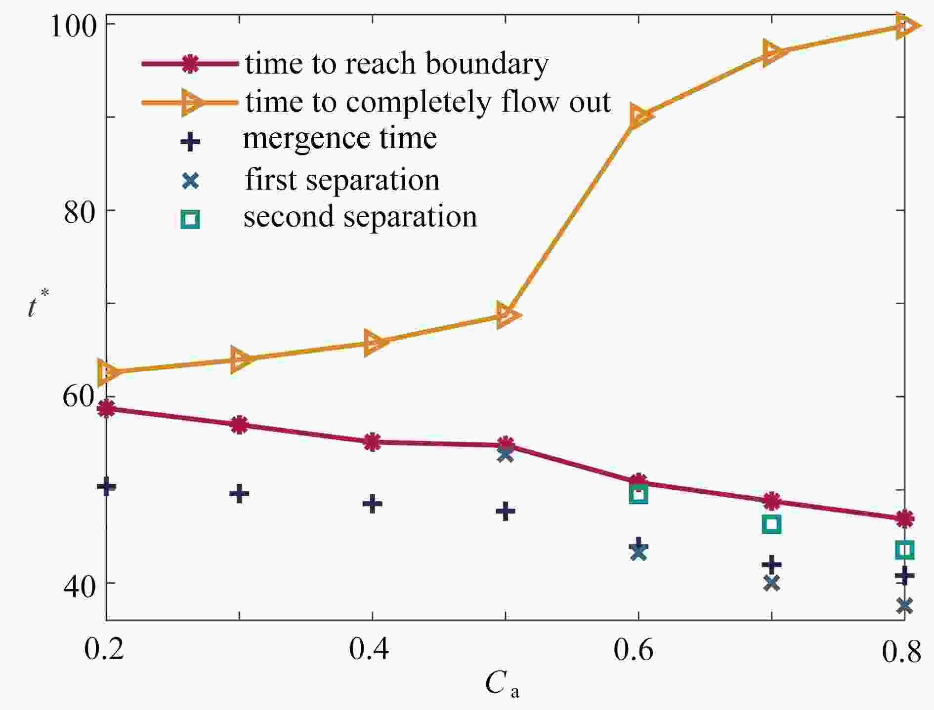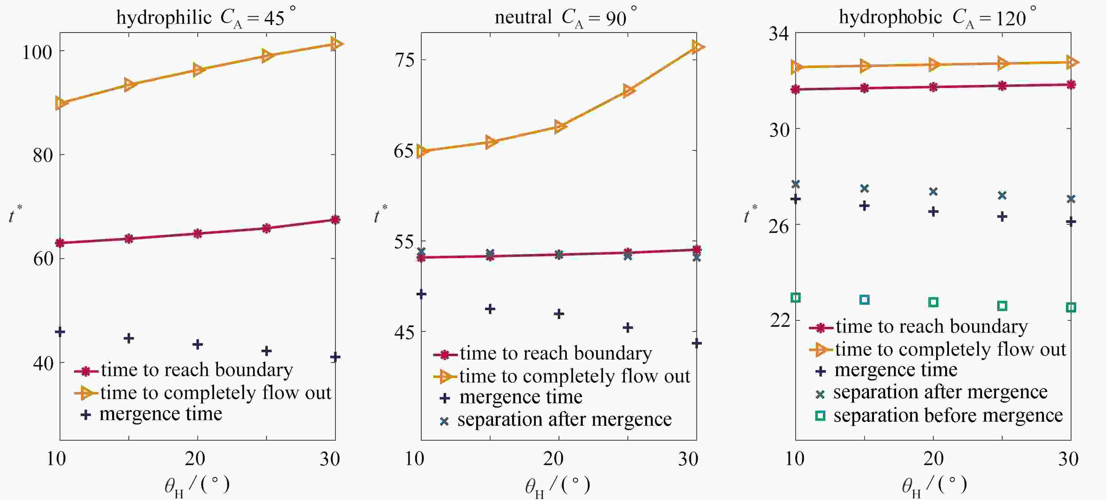 接触角滞后表现为流体在非理想固体表面上运动时前进接触角和后退接触角不同,是两相流体在润湿表面上流动的重要现象。该文采用改进的伪势格子Boltzmann (LB)多组分模型,并与几何润湿边界条件相结合,研究了两个液滴在具有接触角滞后性微通道表面上的运动行为,主要研究了通道内特征数、通道表面性质以及液滴初始参数的影响。研究结果表明:毛细数的增大有助于液滴的移动,然而并不利于液滴的排出,且毛细数的增加对上游液滴的影响大于其对下游液滴的影响;另一方面,接触角滞后性窗口越大,液滴运动和形变更迟缓,但形变程度更明显,两液滴更早地发生合并,但更晚地排出管道;液滴间距的增加使液滴的运动行为在不同阶段表现为不同的模式,但都导致通道中残留小液滴,使得液滴排出通道的时间增加。研究结果还表明:上游液滴和下游液滴的相对尺寸差距越大,越不利于液滴排出管道。