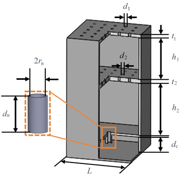 optimization parameter value range optimization result the 1st perforated plate thickness t1/mm 0.5~2 0.51 the 1st perforated plate hole diameter d1/mm 0.3~1 0.89 the 1st perforated plate back cavity thickness h1/mm 5~30 27.90 Helmholtz resonator back cavity thickness dc/mm 5~30 29.90 Helmholtz resonance cavity neck length dn/mm 1~5 4.81 Helmholtz resonant cavity neck radius rn/mm 0.5~2 0.50 the 2nd perforated plate thickness t2/mm 0.5~2 0.50 the 2nd perforated plate hole diameter d2/mm 0.3~1 0.41 the 2nd perforated plate back cavity thickness h2/mm 5~30 15.88 -